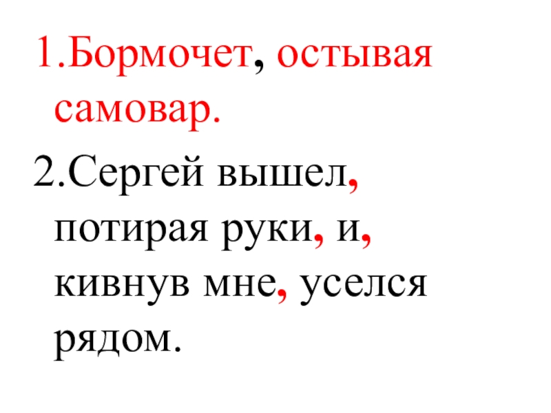 1.Бормочет, остывая самовар.2.Сергей вышел, потирая руки, и, кивнув мне, уселся рядом.