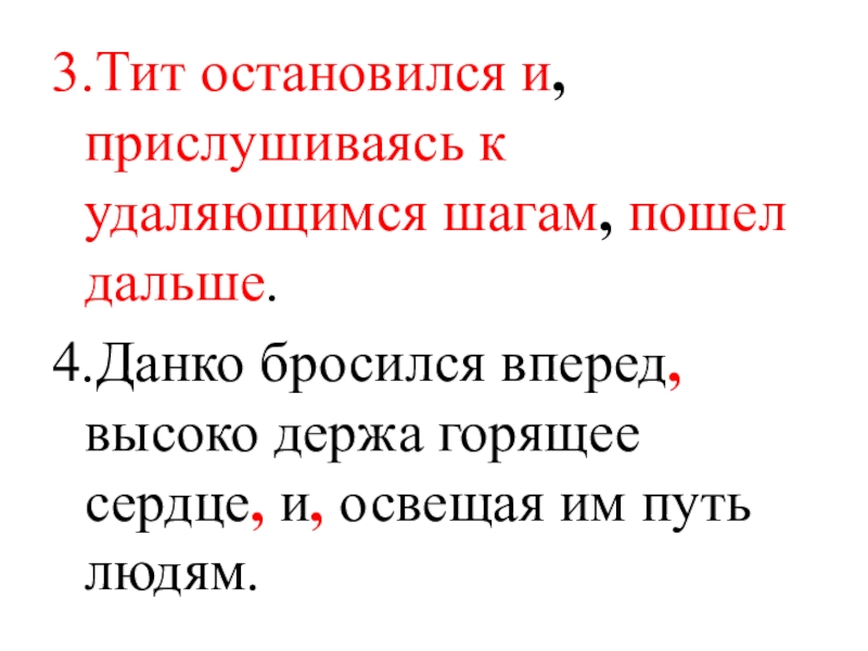 3.Тит остановился и, прислушиваясь к удаляющимся шагам, пошел дальше.4.Данко бросился вперед, высоко держа горящее сердце, и, освещая