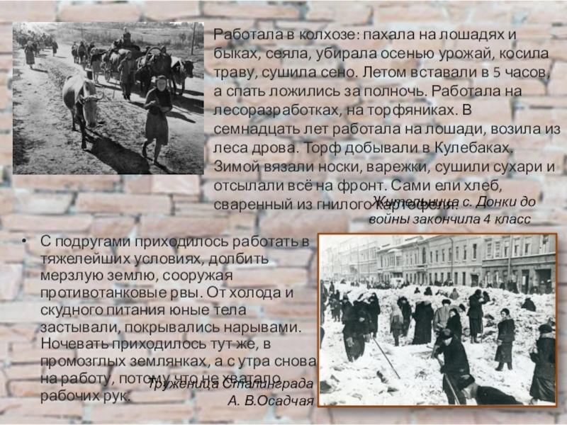 Работала в колхозе: пахала на лошадях и быках, сеяла, убирала осенью урожай, косила траву, сушила сено. Летом вставали в 5 часов, а спать ложились за полночь. Работала на лесоразработках, на торфяниках. В семнадцать лет работала на лошади, возила из леса дрова. Торф добывали в Кулебаках. Зимой вязали носки, варежки, сушили сухари и отсылали всё на фронт. Сами ели хлеб, сваренный из гнилого картофеля.