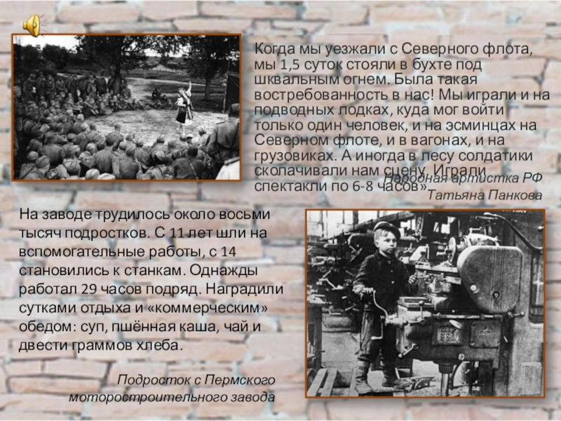 На заводе трудилось около восьми тысяч подростков. С 11 лет шли на вспомогательные работы, с 14 становились к станкам. Однажды работал 29 часов подряд. Наградили сутками отдыха и «коммерческим» обедом: суп, пшённая каша, чай и двести граммов хлеба.