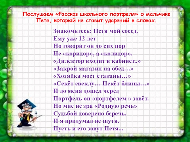 Послушаем «Рассказ школьного портфеля» о мальчике Пете, который не ставит ударений