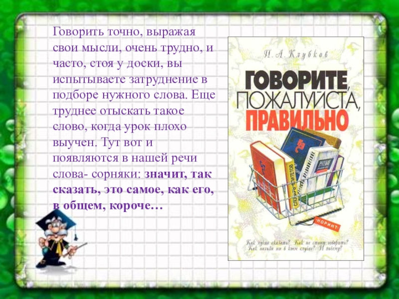 доски, вы испытываете затруднение в подборе нужного слова. Еще труднее отыскать такое слово, когда урок плохо выучен. Тут вот и появляются в нашей речи слова- сорняки: значит, так сказать, это самое, как его, в общем, короче…