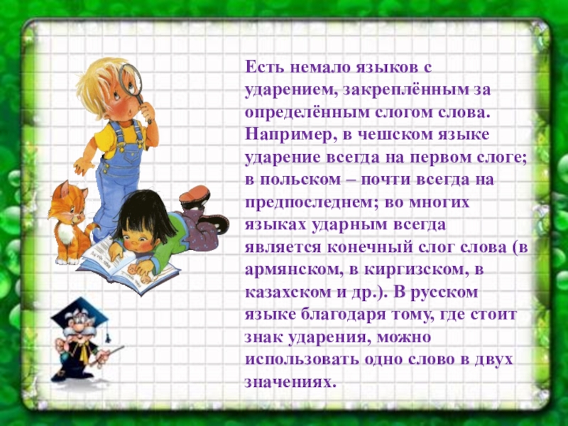 в чешском языке ударение всегда на первом слоге; в польском – почти всегда на предпоследнем; во многих языках ударным всегда является конечный слог слова (в армянском, в киргизском, в казахском и др.). В русском языке благодаря тому, где стоит знак ударения, можно использовать одно слово в двух значениях.