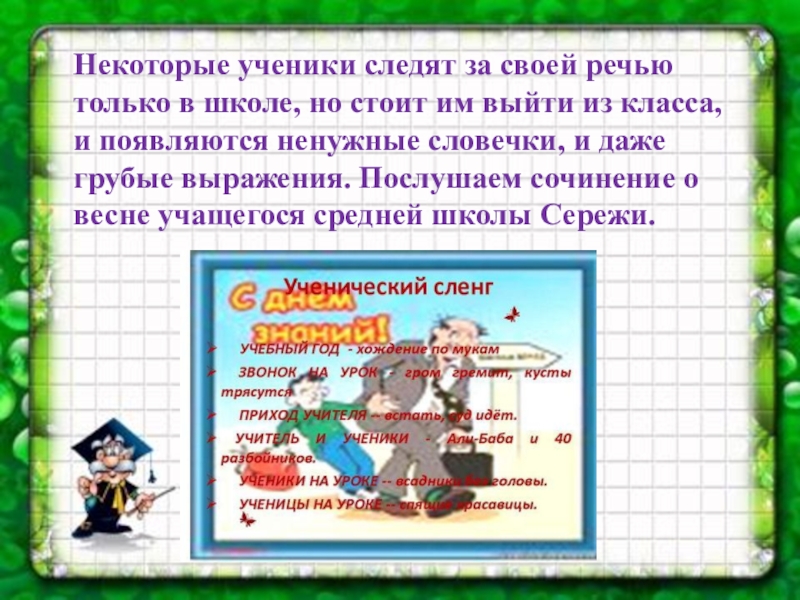 им выйти из класса, и появляются ненужные словечки, и даже грубые выражения. Послушаем сочинение о весне учащегося средней школы Сережи.
