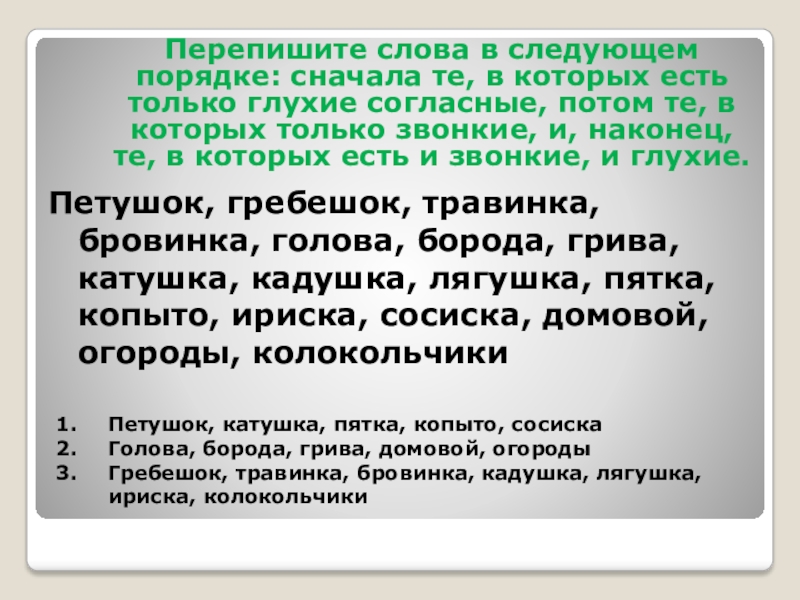 Петушок, гребешок, травинка, бровинка, голова, борода, грива, катушка, кадушка, лягушка, пятка, копыто, ириска, сосиска, домовой, огороды, колокольчики