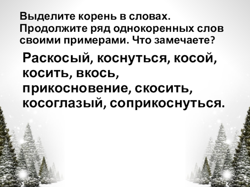 Раскосый, коснуться, косой, косить, вкось, прикосновение, скосить, косоглазый, соприкоснуться.