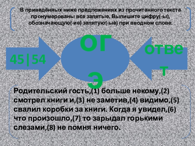 Родительский гость,(1) больше некому,(2) смотрел книги и,(3) не заметив,(4) видимо,(5) свалил коробки за книги. Когда я увидел,(6) что произошло,(7) то зарыдал горькими слезами,(8) не помня ничего.