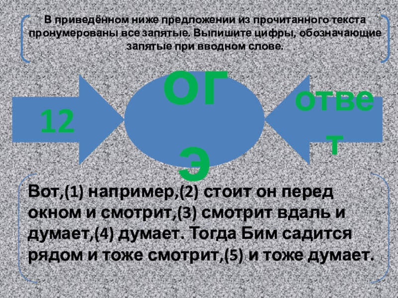 Вот,(1) например,(2) стоит он перед окном и смотрит,(3) смотрит вдаль и думает,(4) думает. Тогда Бим садится рядом и тоже смотрит,(5) и тоже думает.
