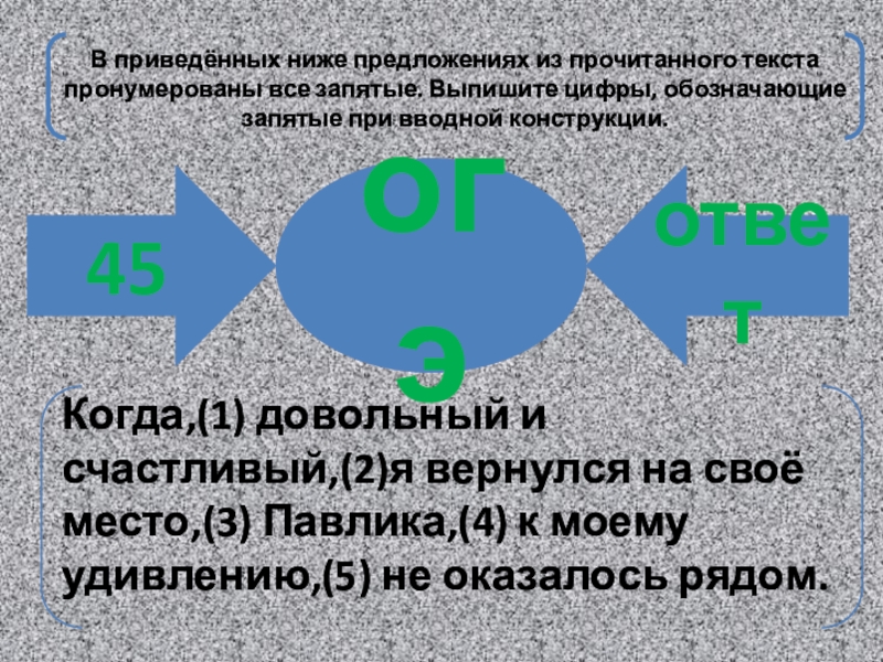 Когда,(1) довольный и счастливый,(2)я вернулся на своё место,(3) Павлика,(4) к моему удивлению,(5) не оказалось рядом.