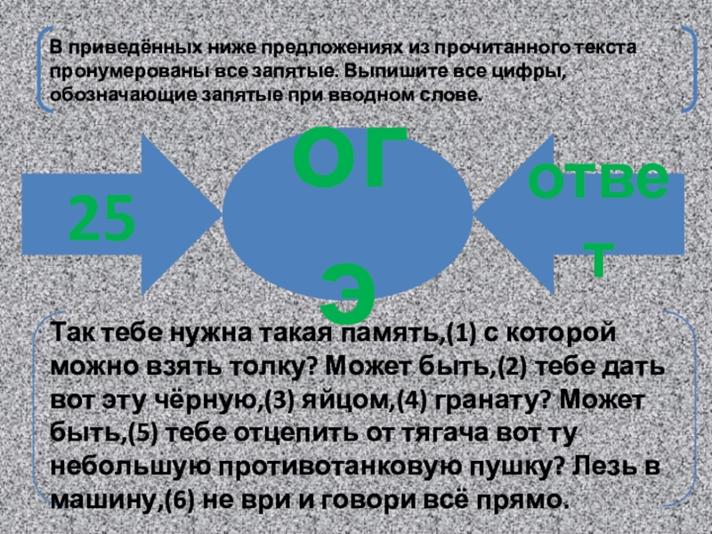 Так тебе нужна такая память,(1) с которой можно взять толку? Может быть,(2) тебе дать вот эту чёрную,(3) яйцом,(4) гранату? Может быть,(5) тебе отцепить от тягача вот ту небольшую противотанковую пушку? Лезь в машину,(6) не ври и говори всё прямо.