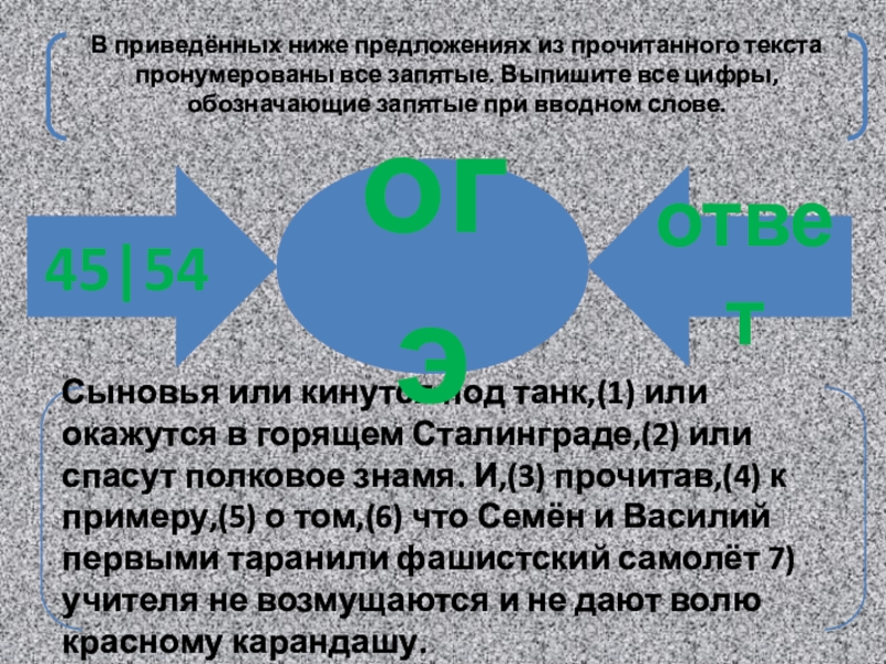 Сыновья или кинутся под танк,(1) или окажутся в горящем Сталинграде,(2) или спасут полковое знамя. И,(3) прочитав,(4) к примеру,(5) о том,(6) что Семён и Василий первыми таранили фашистский самолёт 7) учителя не возмущаются и не дают волю красному карандашу.
