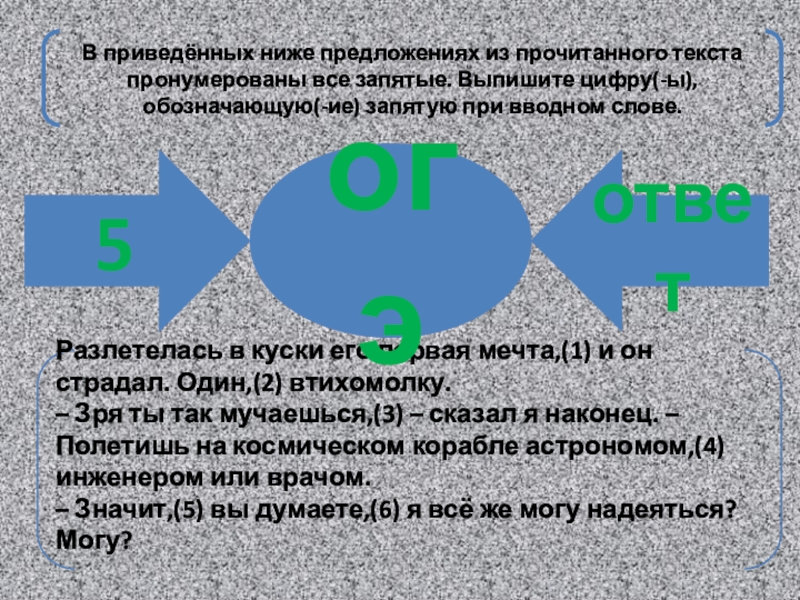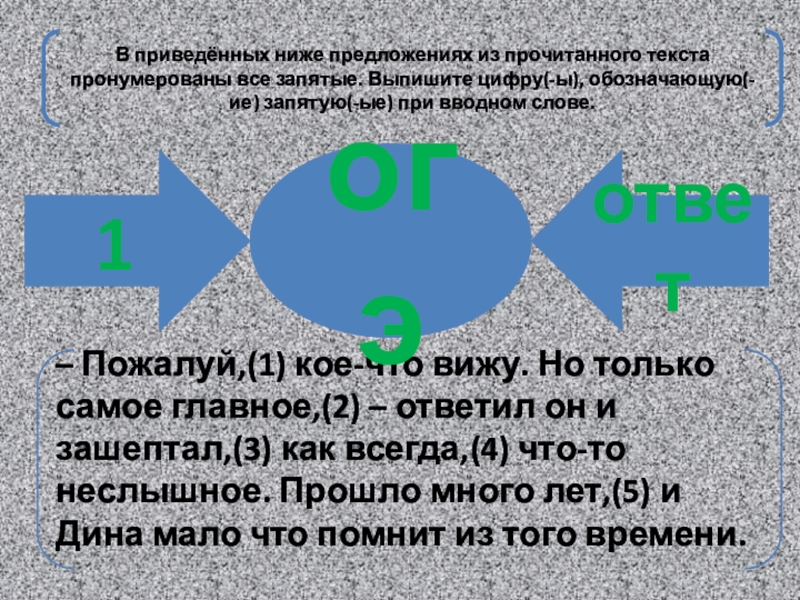 – Пожалуй,(1) кое-что вижу. Но только самое главное,(2) – ответил он и зашептал,(3) как всегда,(4) что-то неслышное. Прошло много лет,(5) и Дина мало что помнит из того времени.