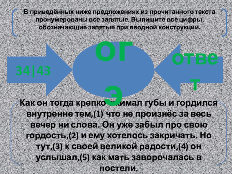 Как он тогда крепко сжимал губы и гордился внутренне тем,(1) что не произнёс за весь вечер ни слова. Он уже забыл про свою гордость,(2) и ему хотелось закричать. Но тут,(3) к своей великой радости,(4) он услышал,(5) как мать заворочалась в постели.