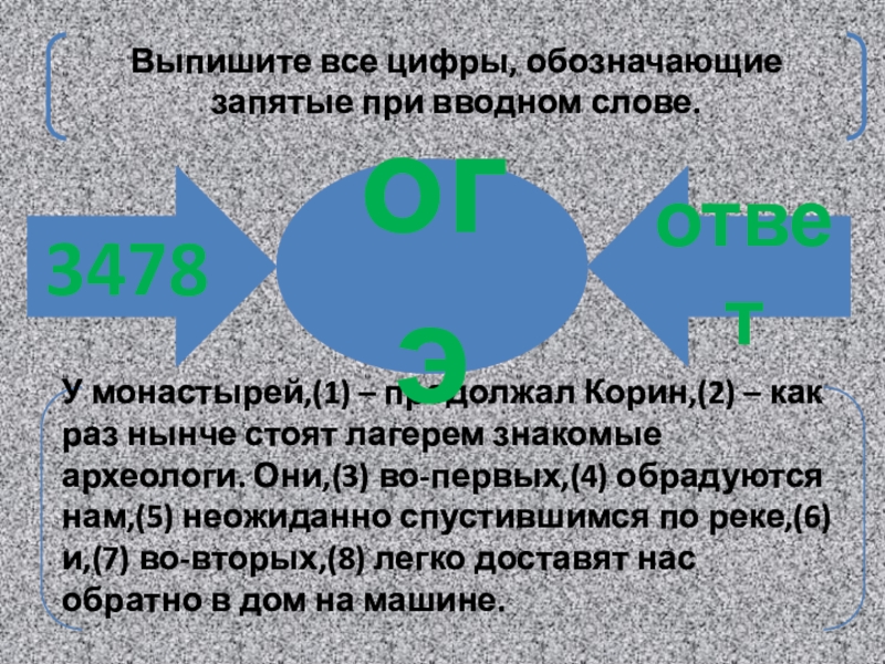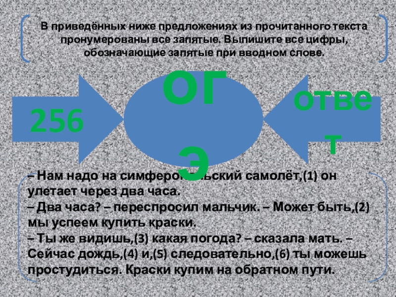 – Ты же видишь,(3) какая погода? – сказала мать. – Сейчас дождь,(4) и,(5) следовательно,(6) ты можешь простудиться. Краски купим на обратном пути.