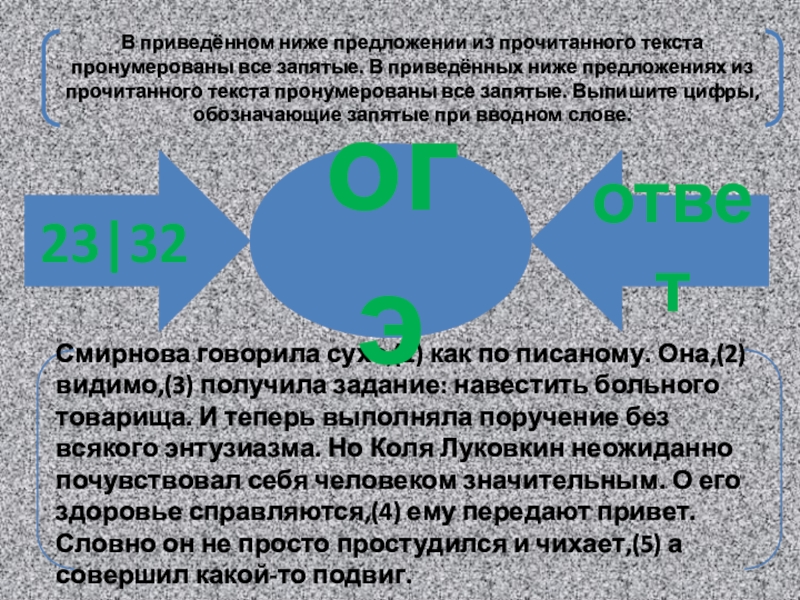 Смирнова говорила сухо,(1) как по писаному. Она,(2) видимо,(3) получила задание: навестить больного товарища. И теперь выполняла поручение без всякого энтузиазма. Но Коля Луковкин неожиданно почувствовал себя человеком значительным. О его здоровье справляются,(4) ему передают привет. Словно он не просто простудился и чихает,(5) а совершил какой-то подвиг.
