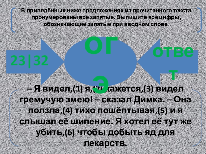 – Я видел,(1) я,(2) кажется,(3) видел гремучую змею! – сказал Димка. – Она ползла,(4) тихо пошёптывая,(5) и я слышал её шипение. Я хотел её тут же убить,(6) чтобы добыть яд для лекарств.
