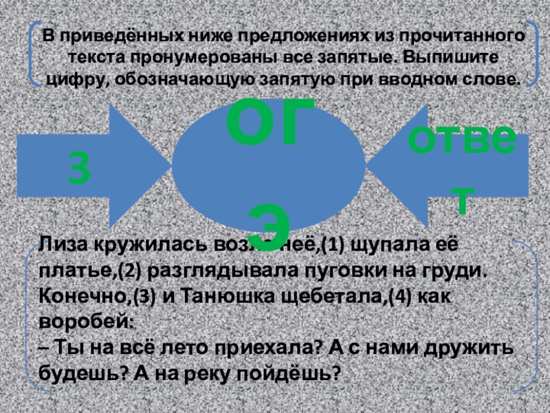 Лиза кружилась возле неё,(1) щупала её платье,(2) разглядывала пуговки на груди. Конечно,(3) и Танюшка щебетала,(4) как воробей: