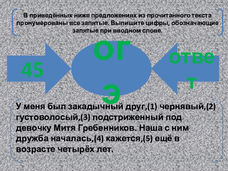 У меня был закадычный друг,(1) чернявый,(2) густоволосый,(3) подстриженный под
