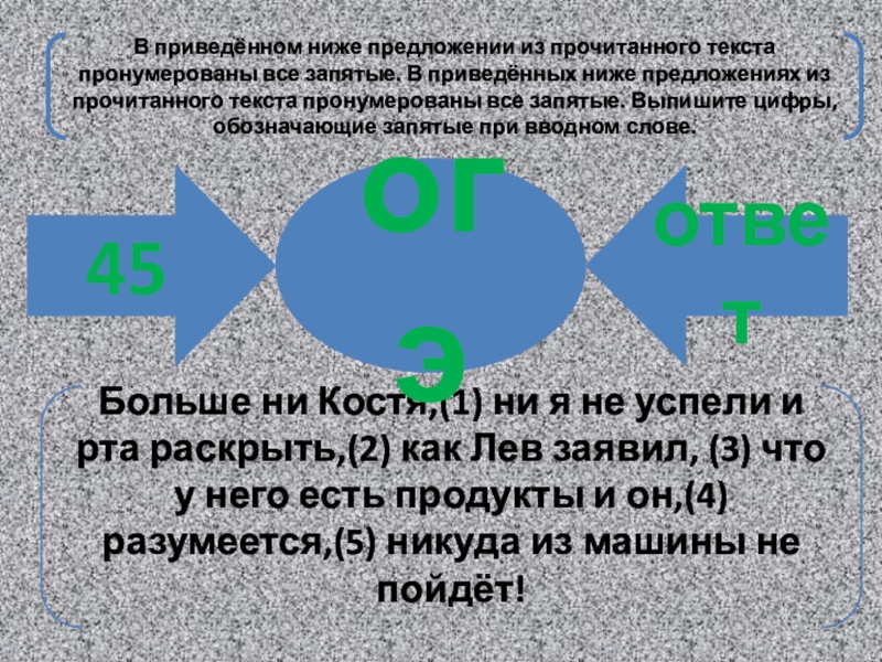 Больше ни Костя,(1) ни я не успели и рта раскрыть,(2) как Лев заявил, (3) что у него есть продукты и он,(4) разумеется,(5) никуда из машины не пойдёт!