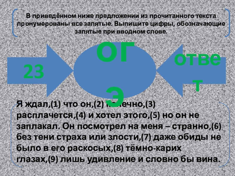Я ждал,(1) что он,(2) конечно,(3) расплачется,(4) и хотел этого,(5) но он не заплакал. Он посмотрел на меня – странно,(6) без тени страха или злости,(7) даже обиды не было в его раскосых,(8) тёмно-карих глазах,(9) лишь удивление и словно бы вина.