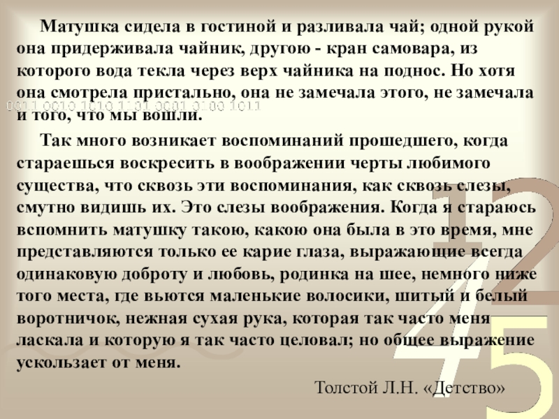 Так много возникает воспоминаний прошедшего, когда стараешься воскресить в воображении черты любимого существа, что сквозь эти воспоминания, как сквозь слезы, смутно видишь их. Это слезы воображения. Когда я стараюсь вспомнить матушку такою, какою она была в это время, мне представляются только ее карие глаза, выражающие всегда одинаковую доброту и любовь, родинка на шее, немного ниже того места, где вьются маленькие волосики, шитый и белый воротничок, нежная сухая рука, которая так часто меня ласкала и которую я так часто целовал; но общее выражение ускользает от меня.
