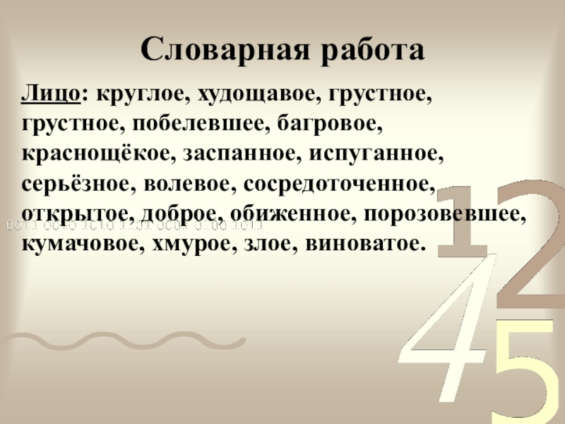 Лицо: круглое, худощавое, грустное, грустное, побелевшее, багровое, краснощёкое, заспанное, испуганное,