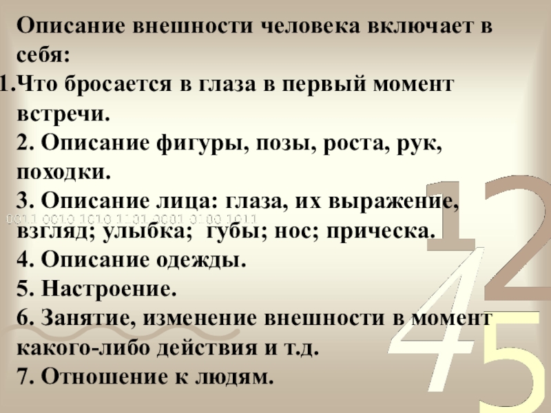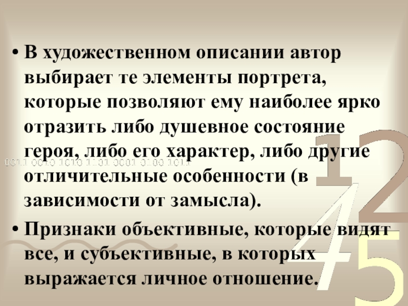 В художественном описании автор выбирает те элементы портрета, которые позволяют ему