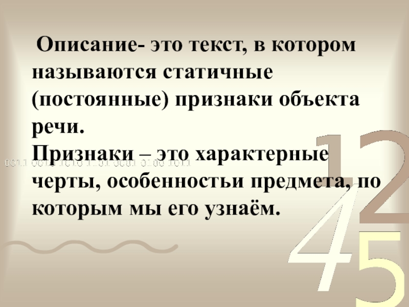 Описание- это текст, в котором называются статичные (постоянные) признаки