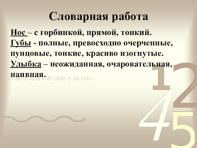 3. Описание лица: глаза, их выражение, взгляд; улыбка; губы; нос; прическа.