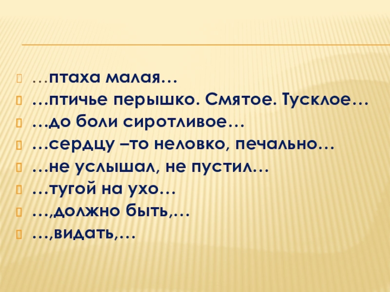 и до боли сиротливое. 5. Может, птаха малая стучала ночью клювом по стеклу, просилась в тепло, а я, тугой на ухо человек, не услышал ее, не пустил. 6. И перышко это как укор белеет на стекле.