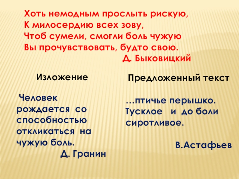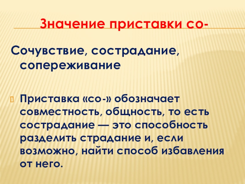 Сострадание – жалость, сочувствие, вызываемые страданием , несчастьем другого человека. (Сл. Ожегова)
