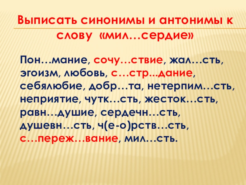 Слайд 24Выписать синонимы и антонимы к слову «мил…сердие»