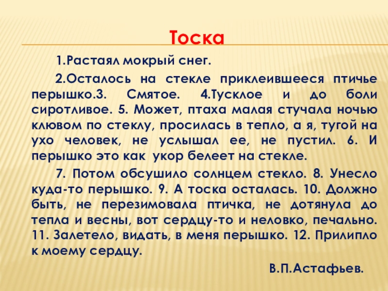 7. Потом обсушило солнцем стекло. 8. Унесло куда-то перышко. 9. А тоска осталась. 10. Должно быть, не перезимовала птичка, не дотянула до тепла и весны, вот сердцу-то и неловко, печально. 11. Залетело, видать, в меня перышко. 12. Прилипло к моему сердцу.