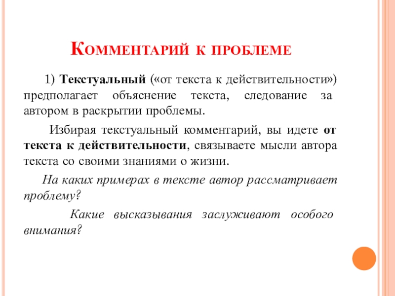 Избирая текстуальный комментарий, вы идете от текста к действительности, связываете мысли автора текста со своими знаниями о жизни.