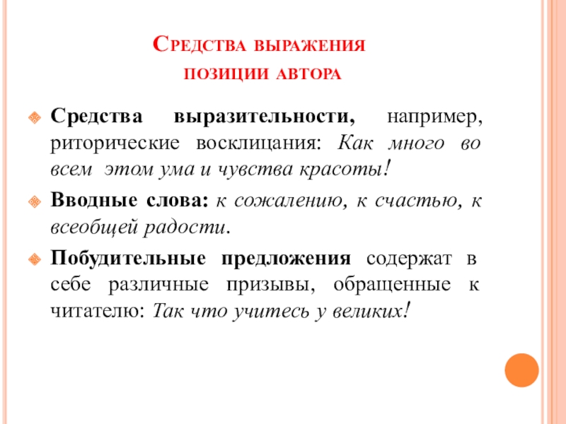 Побудительные предложения содержат в себе различные призывы, обращенные к читателю: Так что учитесь у великих!