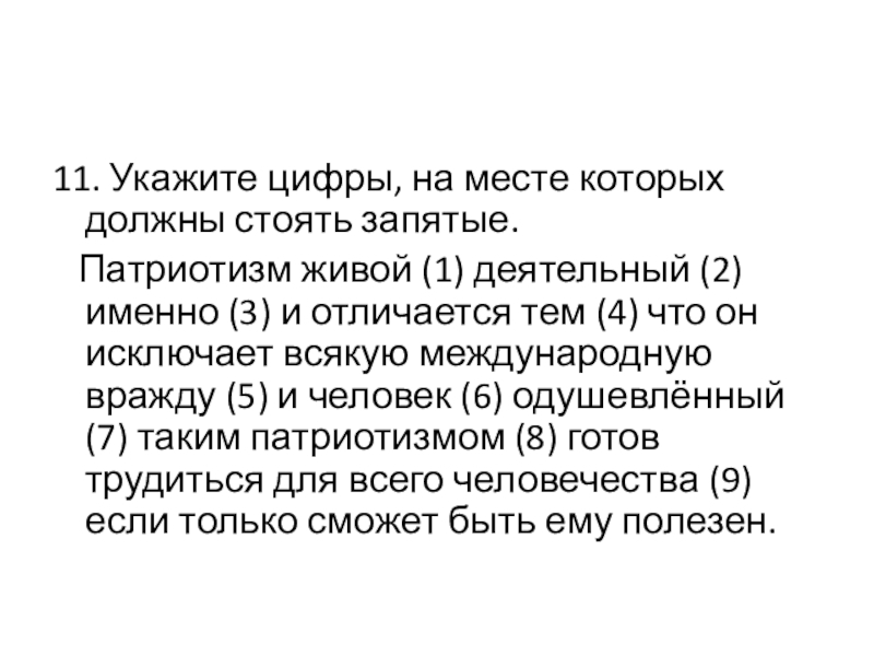 живой (1) деятельный (2) именно (3) и отличается тем (4) что он исключает всякую международную вражду (5) и человек (6) одушевлённый (7) таким патриотизмом (8) готов трудиться для всего человечества (9) если только сможет быть ему полезен.