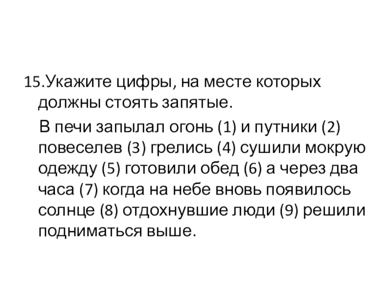 запылал огонь (1) и путники (2) повеселев (3) грелись (4) сушили мокрую одежду (5) готовили обед (6) а через два часа (7) когда на небе вновь появилось солнце (8) отдохнувшие люди (9) решили подниматься выше.