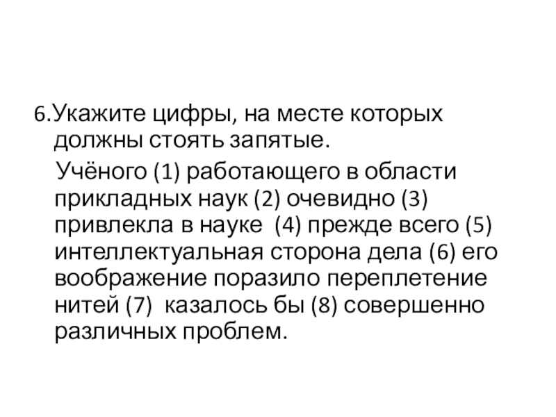 работающего в области прикладных наук (2) очевидно (3) привлекла в науке (4) прежде всего (5) интеллектуальная сторона дела (6) его воображение поразило переплетение нитей (7) казалось бы (8) совершенно различных проблем.