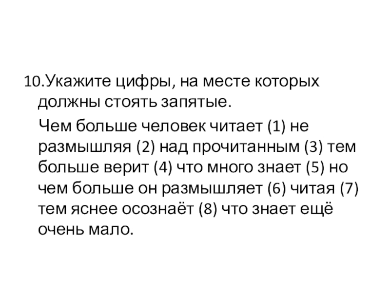 человек читает (1) не размышляя (2) над прочитанным (3) тем больше верит (4) что много знает (5) но чем больше он размышляет (6) читая (7) тем яснее осознаёт (8) что знает ещё очень мало.