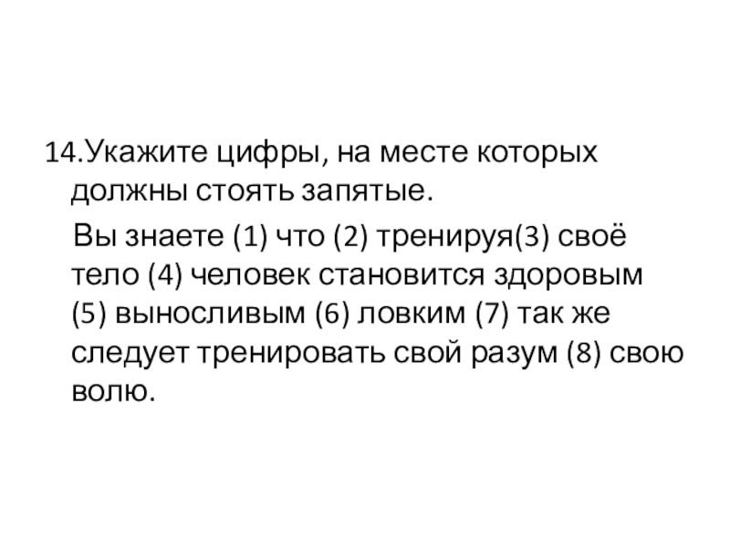 (1) что (2) тренируя(3) своё тело (4) человек становится здоровым (5) выносливым (6) ловким (7) так же следует тренировать свой разум (8) свою волю.