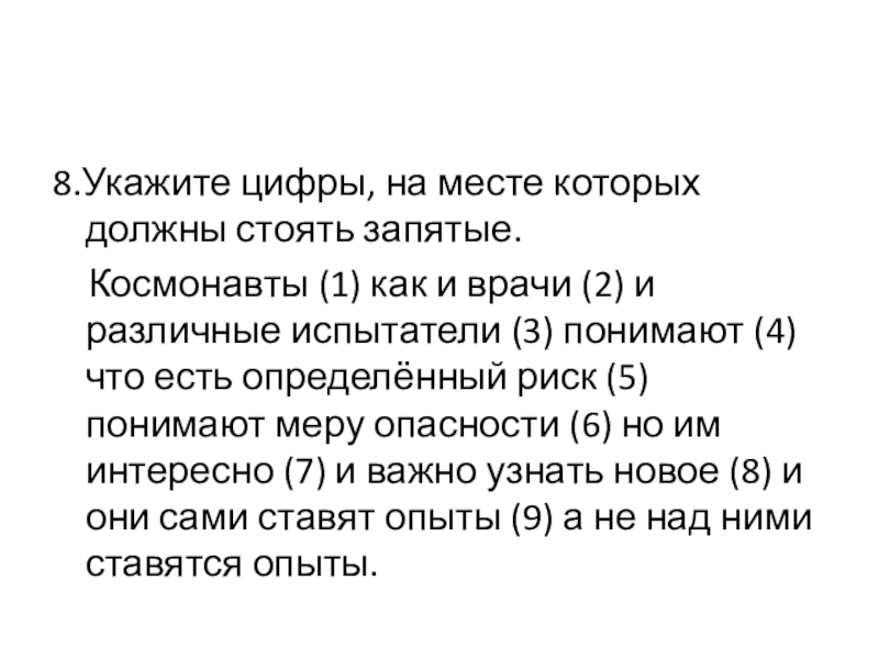 как и врачи (2) и различные испытатели (3) понимают (4) что есть определённый риск (5) понимают меру опасности (6) но им интересно (7) и важно узнать новое (8) и они сами ставят опыты (9) а не над ними ставятся опыты.