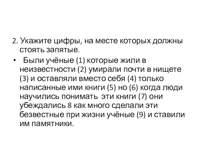 (1) которые жили в неизвестности (2) умирали почти в нищете (3) и оставляли вместо себя (4) только написанные ими книги (5) но (6) когда люди научились понимать эти книги (7) они убеждались 8 как много сделали эти безвестные при жизни учёные (9) и ставили им памятники.
