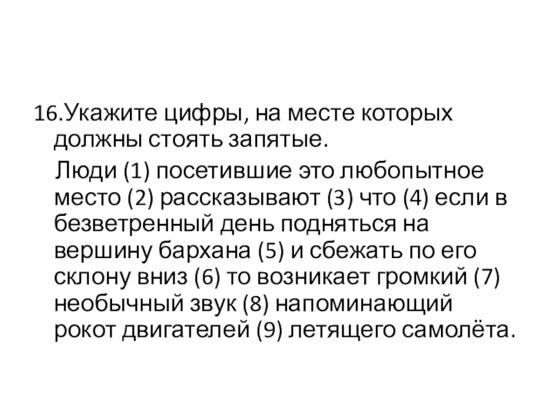 посетившие это любопытное место (2) рассказывают (3) что (4) если в безветренный день подняться на вершину бархана (5) и сбежать по его склону вниз (6) то возникает громкий (7) необычный звук (8) напоминающий рокот двигателей (9) летящего самолёта.