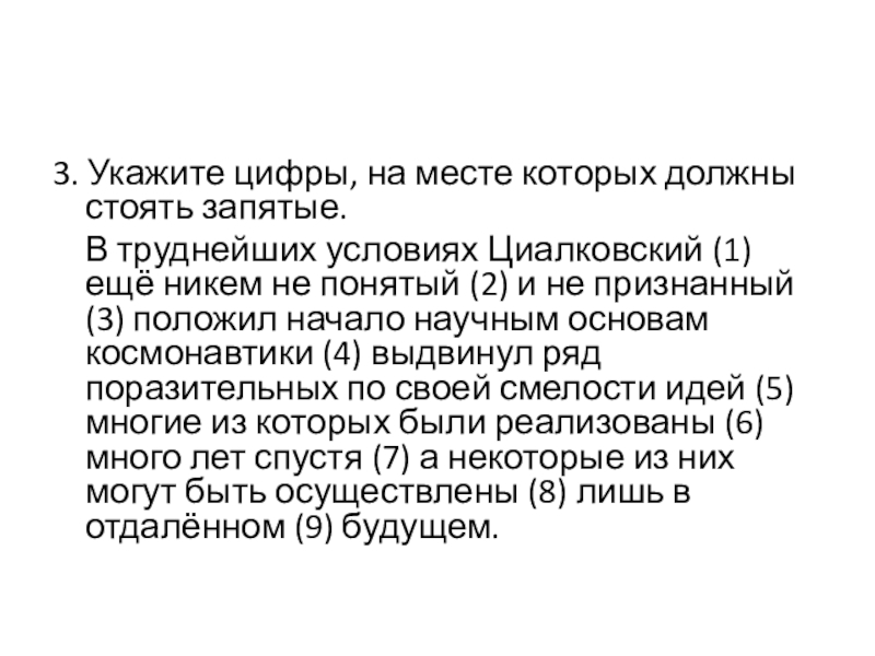 труднейших условиях Циалковский (1) ещё никем не понятый (2) и не признанный (3) положил начало научным основам космонавтики (4) выдвинул ряд поразительных по своей смелости идей (5) многие из которых были реализованы (6) много лет спустя (7) а некоторые из них могут быть осуществлены (8) лишь в отдалённом (9) будущем.
