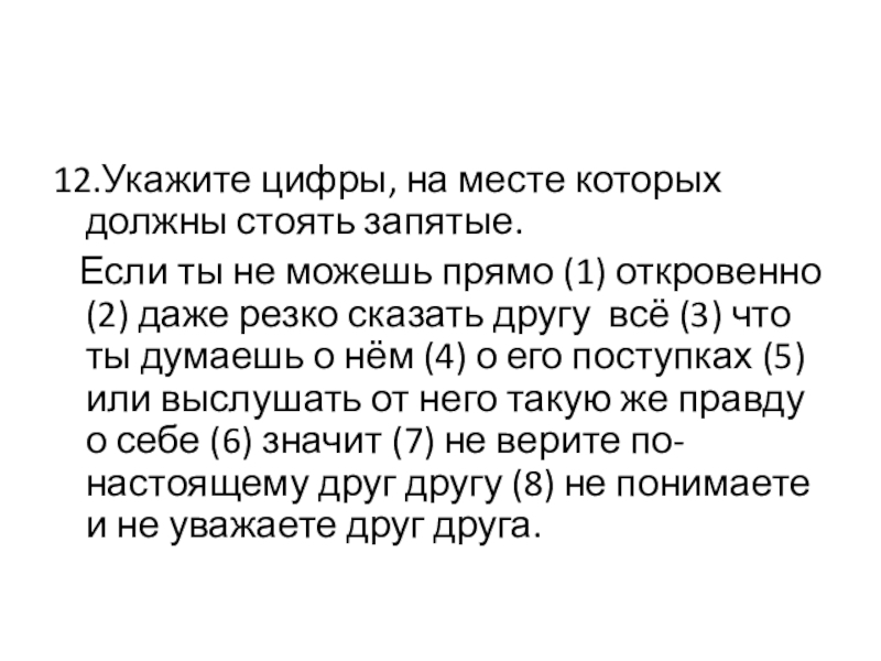 не можешь прямо (1) откровенно (2) даже резко сказать другу всё (3) что ты думаешь о нём (4) о его поступках (5) или выслушать от него такую же правду о себе (6) значит (7) не верите по-настоящему друг другу (8) не понимаете и не уважаете друг друга.