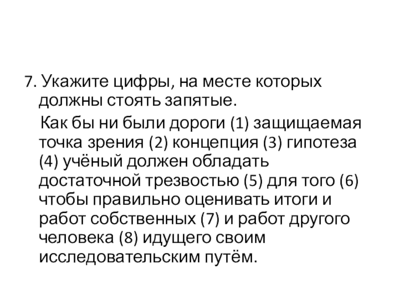бы ни были дороги (1) защищаемая точка зрения (2) концепция (3) гипотеза (4) учёный должен обладать достаточной трезвостью (5) для того (6) чтобы правильно оценивать итоги и работ собственных (7) и работ другого человека (8) идущего своим исследовательским путём.
