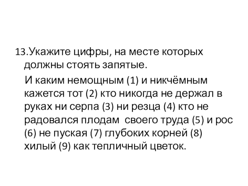 немощным (1) и никчёмным кажется тот (2) кто никогда не держал в руках ни серпа (3) ни резца (4) кто не радовался плодам своего труда (5) и рос (6) не пуская (7) глубоких корней (8) хилый (9) как тепличный цветок.