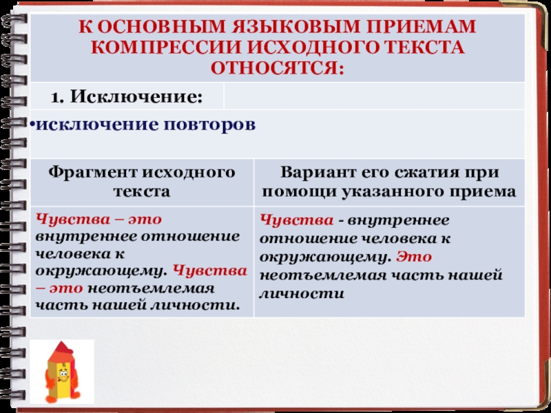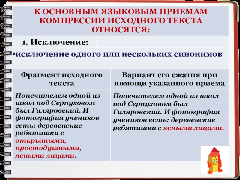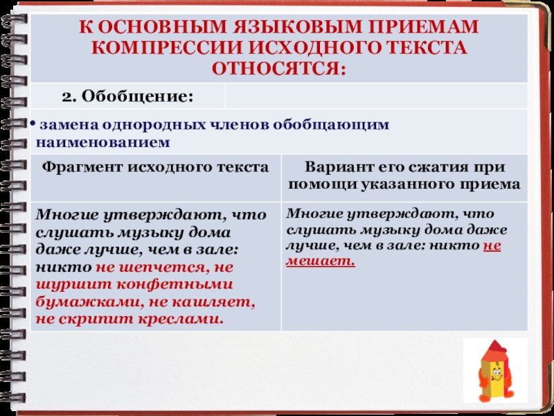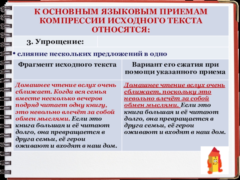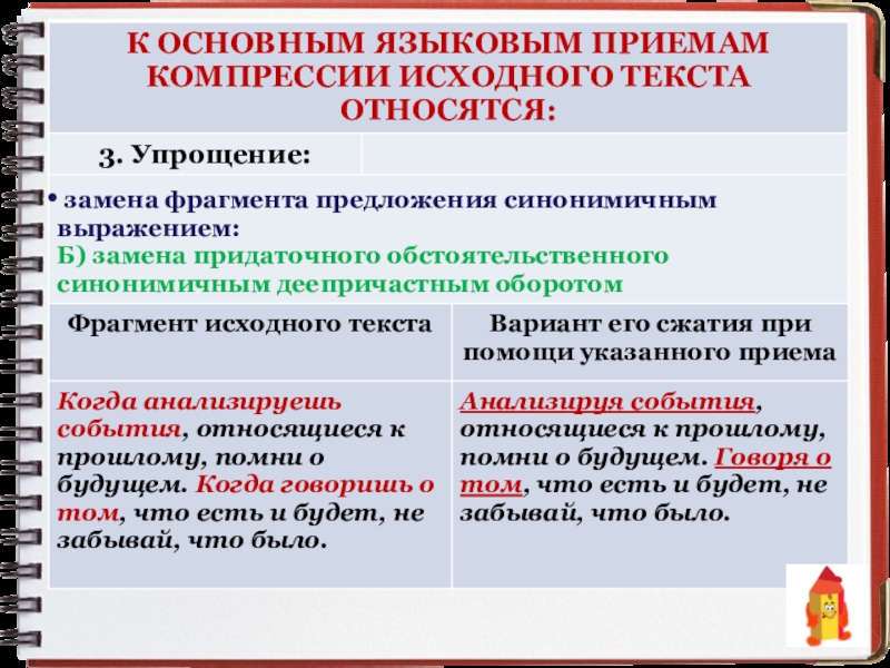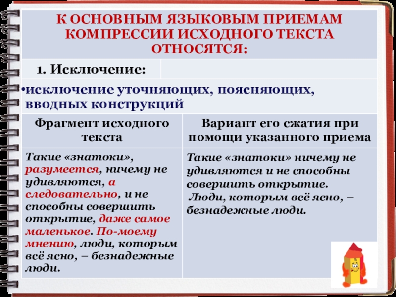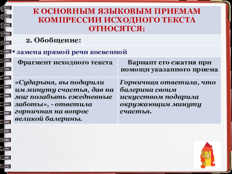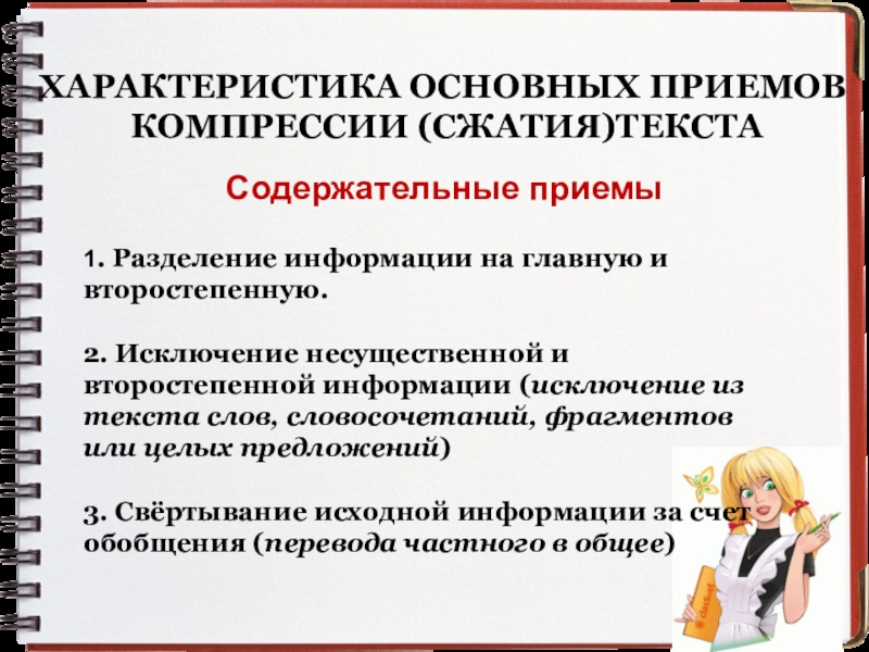 ХАРАКТЕРИСТИКА ОСНОВНЫХ ПРИЕМОВ КОМПРЕССИИ (СЖАТИЯ)ТЕКСТАСодержательные приемы1. Разделение информации на главную и второстепенную.2. Исключение несущественной и второстепенной информации (исключение из текста слов, словосочетаний, фрагментов или целых предложений)3. Свёртывание исходной информации за счет обобщения (перевода частного в общее)
