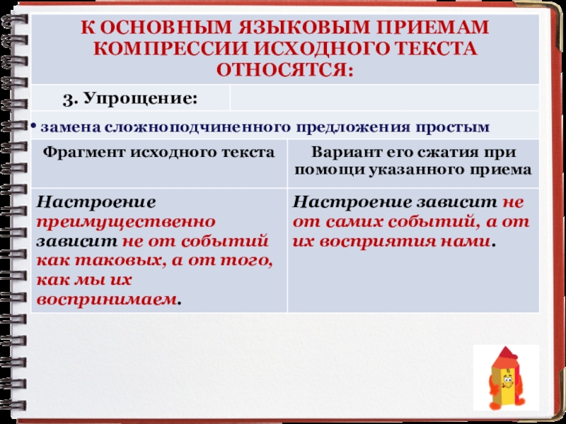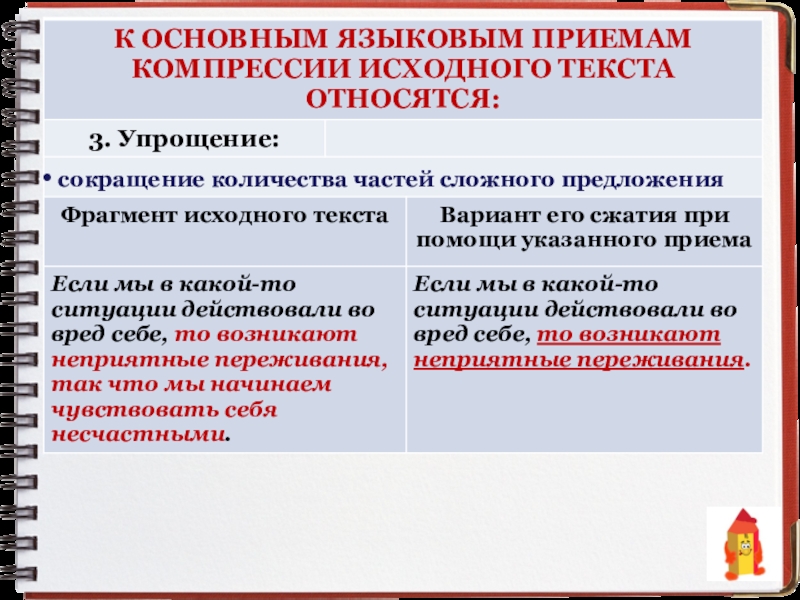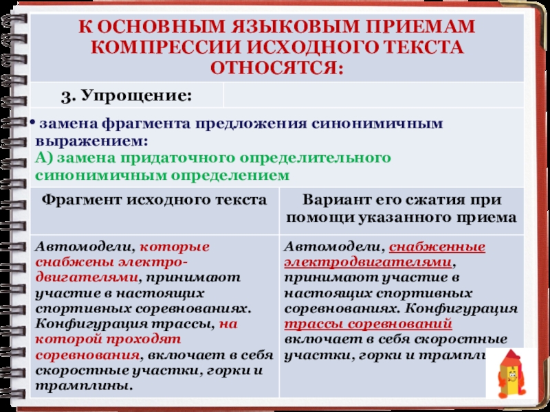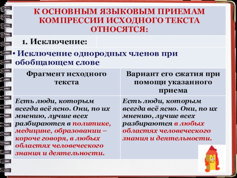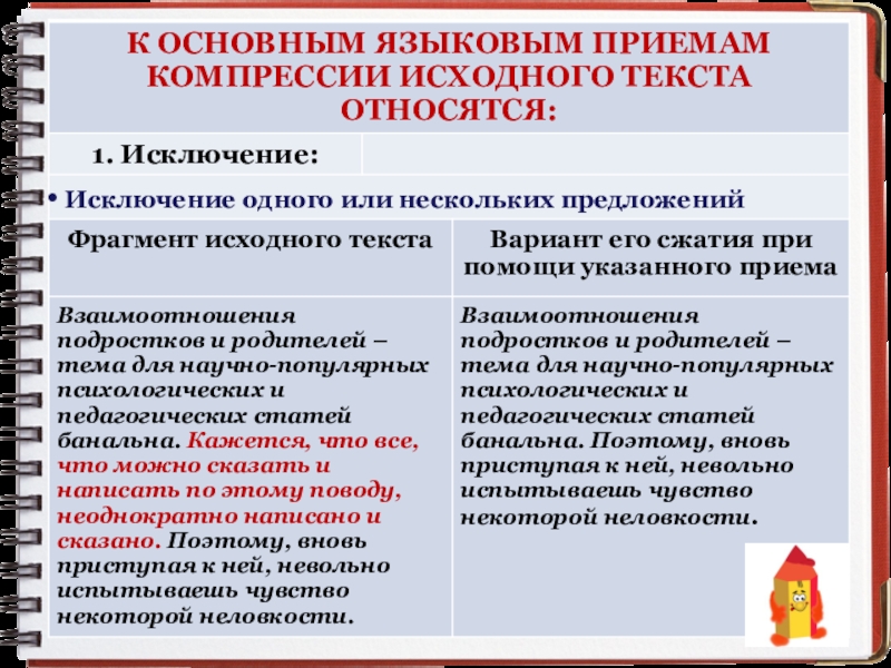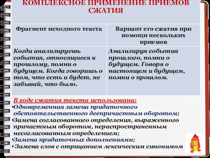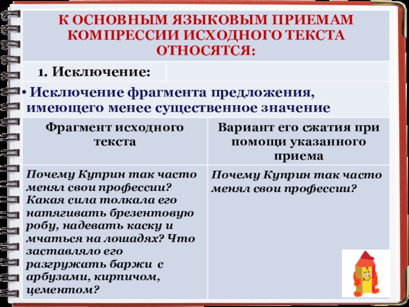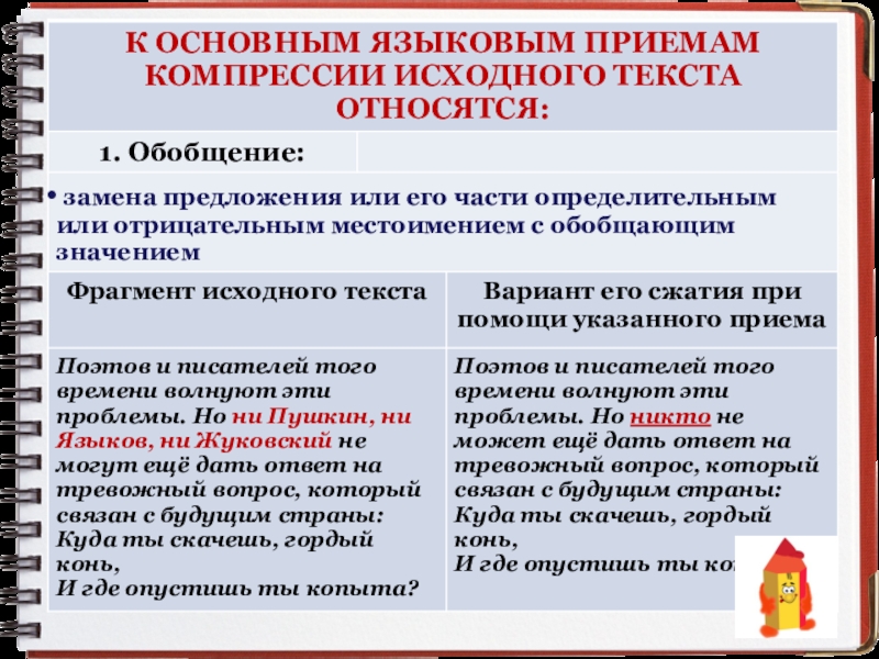 ХАРАКТЕРИСТИКА ОСНОВНЫХ ПРИЕМОВ КОМПРЕССИИ (СЖАТИЯ)ТЕКСТАСодержательные приемы1. Разделение информации на главную и второстепенную.2. Исключение несущественной и второстепенной информации (исключение из текста слов, словосочетаний, фрагментов или целых предложений)3. Свёртывание исходной информации за счет обобщения (перевода частного в общее)