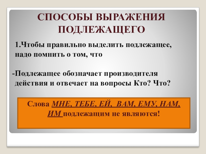 Слова МНЕ, ТЕБЕ, ЕЙ, ВАМ, ЕМУ, НАМ, ИМ подлежащим не являются!
